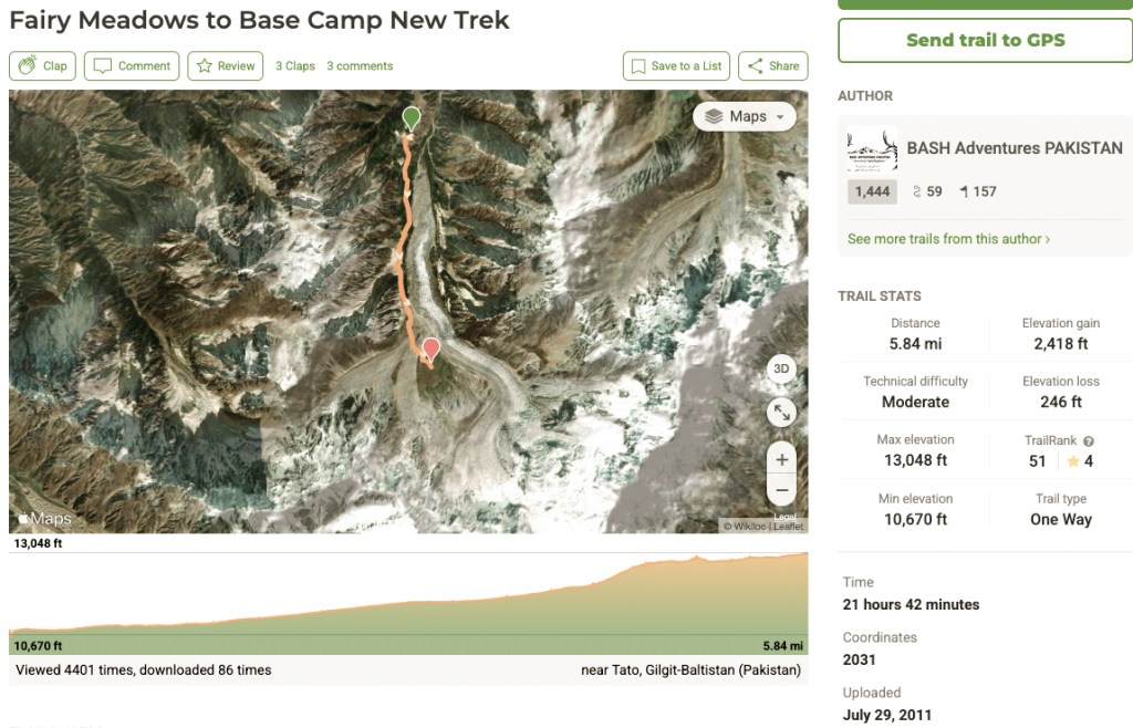 En regardant quels sentiers existent autour du Nanga Parbat, vous notez un sentier qui relie Feary Meadows, un complexe touristique avec hôtels, situé après le village de Tattu, au camp de base du Nanga Parbat. En quelques clics, vous pouvez obtenir le dénivelé global de cette randonnée. Parfois les données sont indiquées en miles et en feet, ce qui nécessite une conversion .